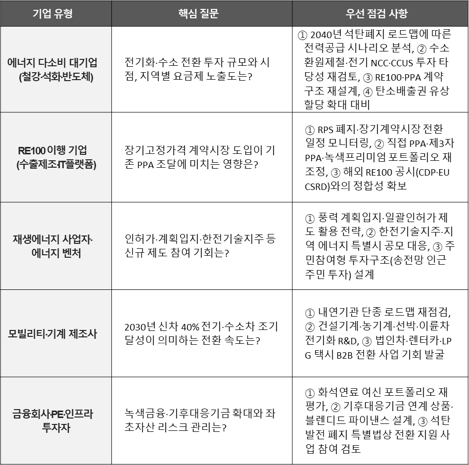 이번 계획은 단순한 에너지 정책을 넘어, 기업의 비용 구조, 투자 의사결정, 공급망 운영 및 공시 대응에까지 영향을 줄 수 있습니다. 영향의 경로와 시급성은 업종별로 상이하며, 각 기업은 아래 매트릭스를 기준으로 자사 리스크·기회 포지션을 진단할 필요가 있습니다.