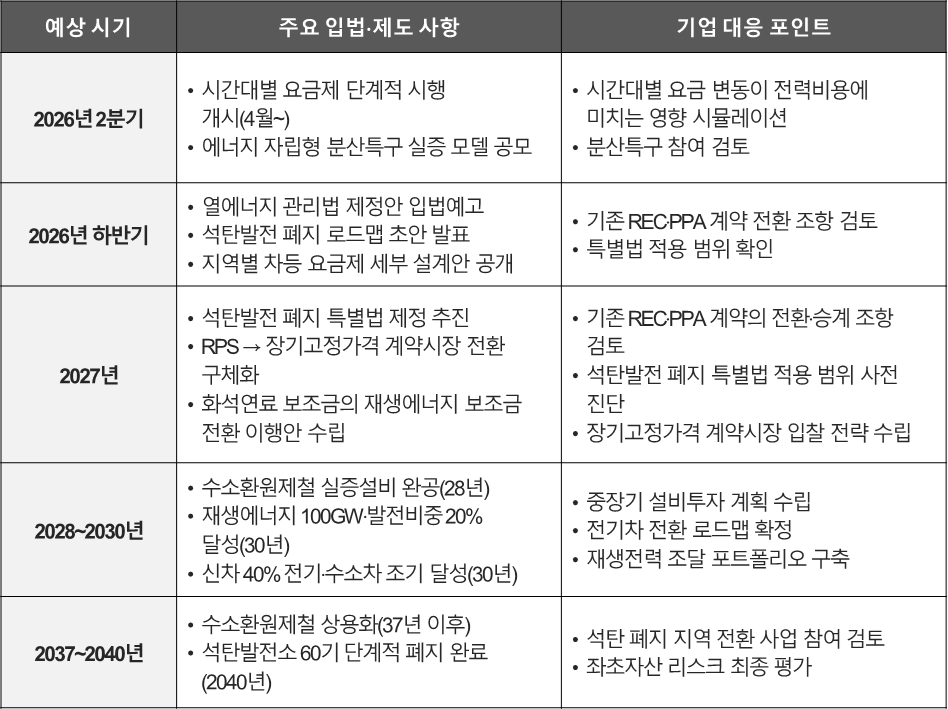 ⑨ 전력시장·요금제는 (1) 송전비용·자립도·균형발전을 반영한 지역별 차등 요금제, (2) 시간대별 요금제(2026년 4월부터 단계 시행), (3) RPS를 대체하는 장기고정가격 계약시장 도입으로 재편됩니다. 이는 재생에너지 사업자, 대규모 전력 수요가(데이터센터·반도체·철강), 수도권 소재 기업 모두에 실질적 비용·수익 영향을 미칠 구조 개편입니다.