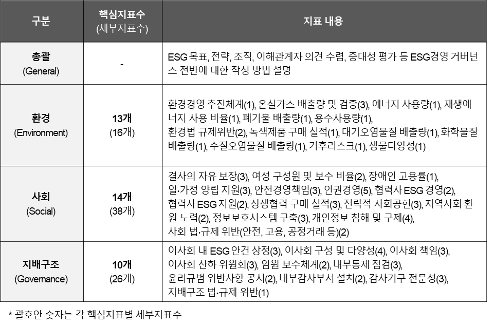 이번에 발표된 가이드라인은 공공기관 ESG 경영 및 공시 보고서 작성의 표준으로 기능할 종합지침으로서, 환경·사회·지배구조 3개 분야에 총 37개 핵심지표와 80개 세부지표로 구성되었습니다. 여기에 더해 각 기관의 ESG 전략·거버넌스 전반을 포괄하는 ‘총괄’ 지표군을 포함하여, ESG 경영 거버넌스 체계까지 함께 다루고 있습니다. 가이드라인은 각 지표별 선정 배경 및 정의, 작성 방법 및 예시 등을 상세하게 설명하고 있으며 지표체계의 전반적인 구조는 다음과 같습니다.
