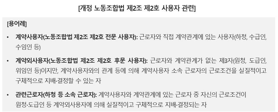 A1. 개정 노동조합법에서는 계약외사용자에 관하여 ‘실질적, 구체적인 지배∙결정’이라는 요건을 규정하였는데, 고용노동부는 이번 해석지침(안)에서 계약외사용자성 판단에 관하여 ① 근로조건의 지배∙결정에 대한 구조적 통제를 핵심 판단 고려요소로 보고, ② 계약외사용자 사업에 계약사용자의 편입 여부, 계약사용자가 계약외사용자에게 경제적으로 종속되어 있는지 등 판단 요소도 보완적 징표로 고려하여 이를 종합적으로 판단할 필요가 있다는 의견을 밝혔습니다. 위와 같은 고용노동부의 의견은 행정해석의 차원에서 제시한 것이고, 실제로 개정 노동조합법의 ‘실질적, 구체적인 지배∙결정’이라는 요건을 판단할 때 고용노동부가 제시한 ‘근로조건의 지배∙결정에 대한 구조적 통제’를 핵심 판단 고려요소로 삼을 것인지는 최종적으로 법원의 판례에 의해 결정될 것입니다.