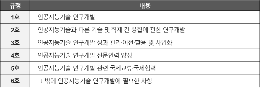 이번 개정안은 인공지능연구소의 설립·운영과 인공지능연구소에 대한 정부의 출연·보조 등 지원, 보조금·기부금 내지 수익사업을 통한 재원 마련, 인력 파견 지원 등 여러 지원방안의 근거를 마련함으로써, 국내 인공지능연구소의 연구개발 역량을 확대하고 인공지능산업 육성을 위한 토대를 정비하였습니다.